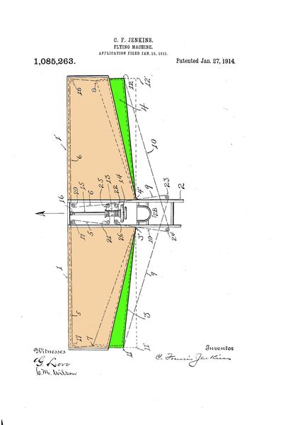To all you magnificent men and women in your flying machines: I, a humble non-flyer, dedicate this article. How I look skyward with envy whenever I see a Cessna, Piper or Beechcraft fly overhead! And in absolute awe, I stare at a pilot stunting about in his Stearman. Yet alas, I am destined to be, at best, a passenger on various aircraft, owned and piloted by others. I do know a little something about flying machines that the majority of you do not. It is not just what, but who allows you to fly through the air with the greatest of ease. But first a question: What do paper milk cartons, improved men’s gaiters, improved power lawn mowers, television, DVDs, underwater photography, motion pictures, commercial radio broadcasts, the F-111 fighter-bomber, as well as automobiles, all have in common? The answer is: inventor, Dr. C. (Charles) Francis Jenkins. Who is Jenkins? He was born in 1867 to an Ohio Quaker farm family. They moved to Richmond, Ind., where he spent his childhood. Eventually he briefly attended Earlham College and later the Bliss School of Electrical Engineering. He spent time in the west working various mechanical jobs and enjoying a life of adventure. Later he moved to Washington, D.C., where he obtained employment in the U.S. Life Saving Service working for Sumner I. Kimball, the department head. While working as a clerk (shades of Einstein), he began to tinker with both still and motion picture cameras. He became so proficient at what he was doing that he made a deliberate decision to become an inventor. Thus he sent a letter to Mr. Kimball stating, in part, “that he had determined that inventing should keep him.” He became so successful that the inventions listed above are only a small sample of his vast body of work.1 Why did Jenkins take up trying to improve flying-machines? A definitive answer does not exist; it seems that flying simply took hold of his imagination, just as space-flight would grip a later generation. All he said was, “…the study of airplane possibilities was begun: of course, from a layman’s point of view.” And even though Jenkins himself considered many of his flying machine patents “foolish and impractical,”2 this is not so; and I will prove it in two steps. First, several of his ideas are so fundamental that without them the flying machine would still be a kite. Second, several patents were so well designed that they yet may come to fruition. Now, before these points about his contributions to flight can be proved, it is important to examine how flying began and even a typical preflight routine. In the beginning man could not fly; the birds were happy. Then on December 17, 1903, the twin gods of flight, Orville and Wilbur Wright, hurled their immutable laws of flight from a lofty sand hill at Kitty Hawk, N.C.; the birds were dismayed. Further the brothers codified their laws with patent number 821,393.3 The patent clearly stated two of their three principles essential to flight: wing-warping and a one-piece movable tail rudder assembly. The third principle was understood; a sturdy ground crewman was needed to turn the propeller and start the . . . |