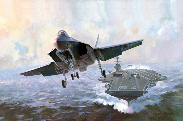 The Keith Ferris painting Lightning at Sea (back cover) was commissioned by Pratt & Whitney Military Engines for presentation to the navy at its Naval Aviation Symposium at Pensacola in early May 2016. The 32” x 56” oil painting on canvas depicts the navy’s new Lockheed Martin F-35C Lightning II stealthy carrier fighter launching in the future from the navy’s newest new carrier CVN 78, the
