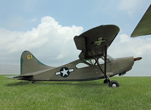 Stinson L-5G, N63397, painted as a USMC OY-1 in the colors of VMO-3. This "ambulance" version is easily identifiable by the doors on the right side. Also note the leading edge slots and flaps that enhance low-speed performance. (Photo by Bob Burns)