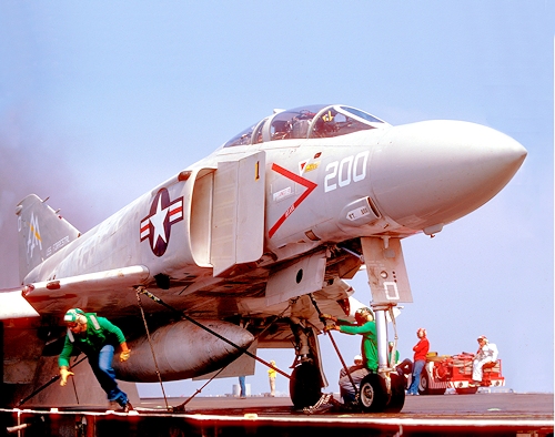 Photographer Robert Burns captures the drama of the launch of McDonnell Douglas F-4J Phantom II, BuNo 153784, of VF-74 from the deck of the USS Forrestal, August 2, 1977.