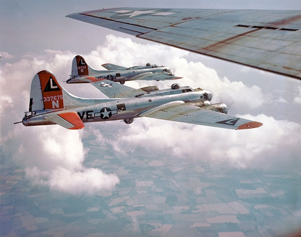 A rare color photo of a formation of B-17Gs from the 391BS taken sometime around February 1944. (USAF photo from the Bill Norton collection)