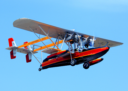 One of two replica Sikorsky S-38s flys over at EAA Airventure 2006. Built by Born Again Restorations, NC6V has been painted to respresent the S-38B that H.F. Johnson (Johnson Wax) purchased and flew to South America in search of Carnauba palm trees. (Photo by Robert Burns)
